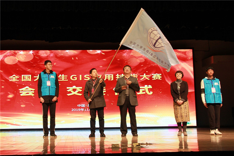 闭幕式最后,汤国安教授致闭幕辞,代表教育部地理科学类教学指导委员会表达了对于本届大赛承办单位安徽师范大学的由衷感谢,称赞本届大赛是历届以来规模最大、内容最丰富、组织最严密、结果最圆满的一届,并与本届大赛承办单位代表、安徽师范大学565net必赢客户端副院长曹卫东,下一届大赛承办单位代表、华中师范大学副院长谢双玉,共同举行会旗交接仪式