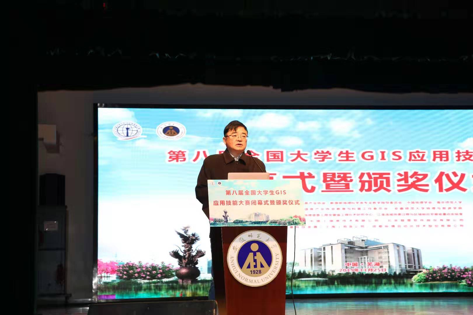 11月25日上午9时,大赛闭幕式暨颁奖典礼于安徽师范大学花津大礼堂举行。闭幕式由安徽师范大学地理科学与旅游学院院长苏勤主持,中国地理信息产业协会秘书长王增宁,中国地理学会副理事长、中科院地理科学与资源研究所研究员张国友等中国地理信息产业协会、教育部地理科学类专业教学指导委员会、中国地理学会领导代表,大赛组委会委员,赞助单位代表,评委,大赛承办单位安徽师范大学领导老师,以及参赛高校全体师生参加了闭幕式。