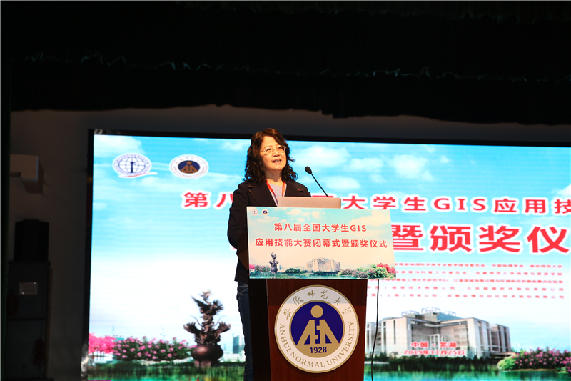 刘耀林主持颁奖典礼,宣读获奖名单。武汉大学、中山大学、南京师范大学等12所高校团队获得特等奖;浙江大学、中南大学、电子科技大学等26所高校团队获得一等奖;北京大学、兰州大学、中国矿业大学等60所高校团队获得二等奖;万义良等23名指导教师获特等奖优秀指导教师奖;安徽师范大学获优秀组织奖,安徽师范大学565net必赢客户端院长苏勤获特别贡献奖。