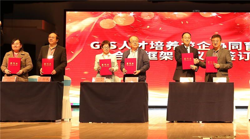 为全面推行校企协同育人,加强校企双方在课程体系建设与改革、实习与实训基地建设、就业创业、国际化交流、师资合作与培训、教材研发等方面开展深度合作,提高大赛的社会影响和促进人才培养的作用,本次闭幕式还举行了GIS人才培养校企协同育人战略合作框架协议书签订仪式、企业代表与获奖学生代表就业意向协议书签订仪式。来自中国地理信息产业协会教育与科普工作委员会的5位高校代表与易智瑞(中国)信息技术有限公司等5家企业的代表上台签订校企协同育人战略合作框架协议;来自北京超图软件股份有限公司等5家企业的代表与来自南京大学、安徽师范大学等高校的获奖学生代表签订就业意向协议书。
