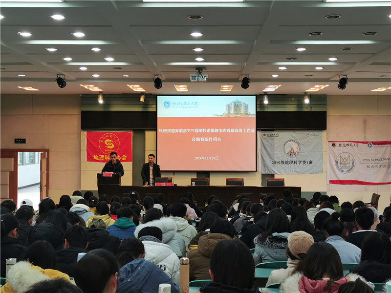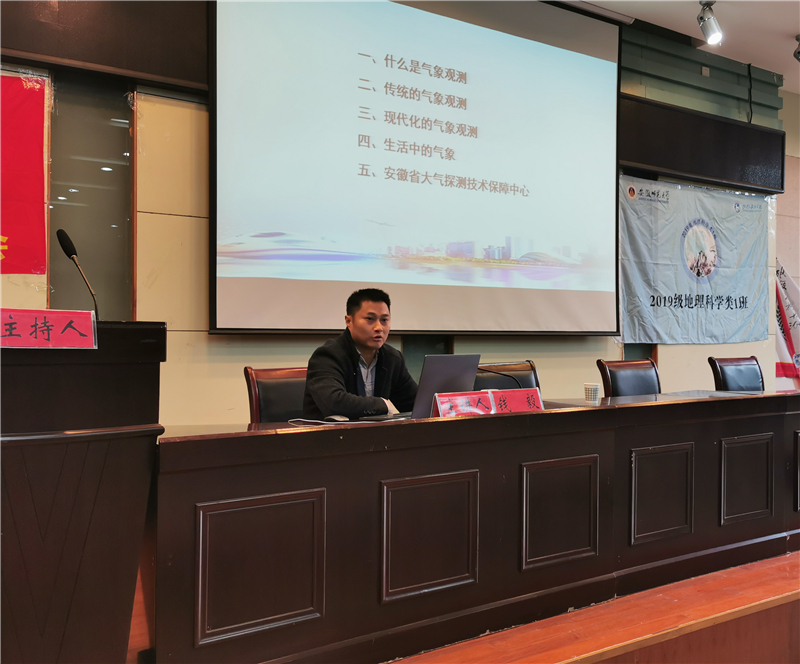 本网讯(565net必赢客户端 高诗涵 齐小学)12月20日下午,安徽省大气探测技术保障中心高级工程师钱毅应邀到565net必赢客户端101报告厅作了题为《气象观测介绍》的专题报告。学院团委书记陈祥云,2019级地理科学类1班、2班和拔尖人才班学生,地理科普协会会员参加本次报告会。报告会由2019级地理科学大类辅导员齐小学主持。