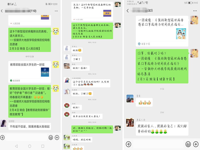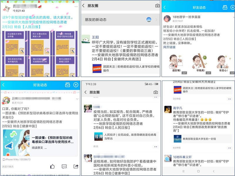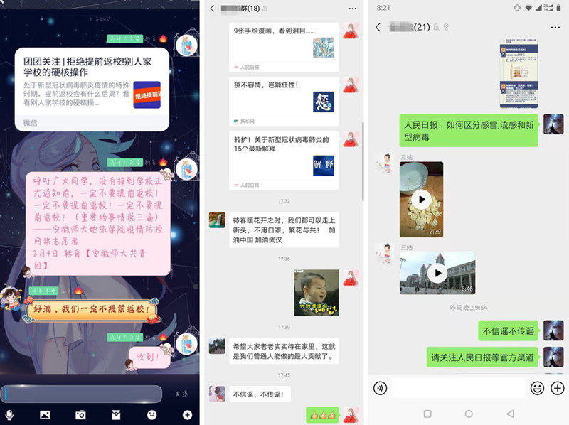 为便于工作开展,学院建立了网络志愿者微信群和QQ群。学院团委每日从人民日报、新华社、共青团中央等官方主流媒体发布的信息中精心挑选1-3条信息,并发布至学院网络志愿者群,按照统一格式进行配文,注明信息来源,再由志愿者们转发到自己所在的家人群、同学群等微信和QQ群,或分享到朋友圈和QQ空间等“网络社区”。统一转发的信息特别注重信息来源的选择和信息内容的甄别,信息来源确保一定为主流权威媒体,信息内容一般是官方发布的科学防控知识、辟谣信息、疫情防控进展以及上级有关部门关于疫情防控工作的通知和要求等疫情防控的权威信息。