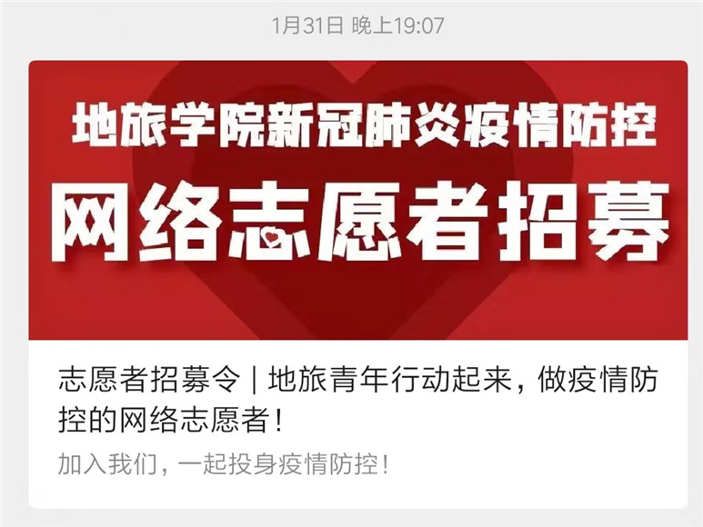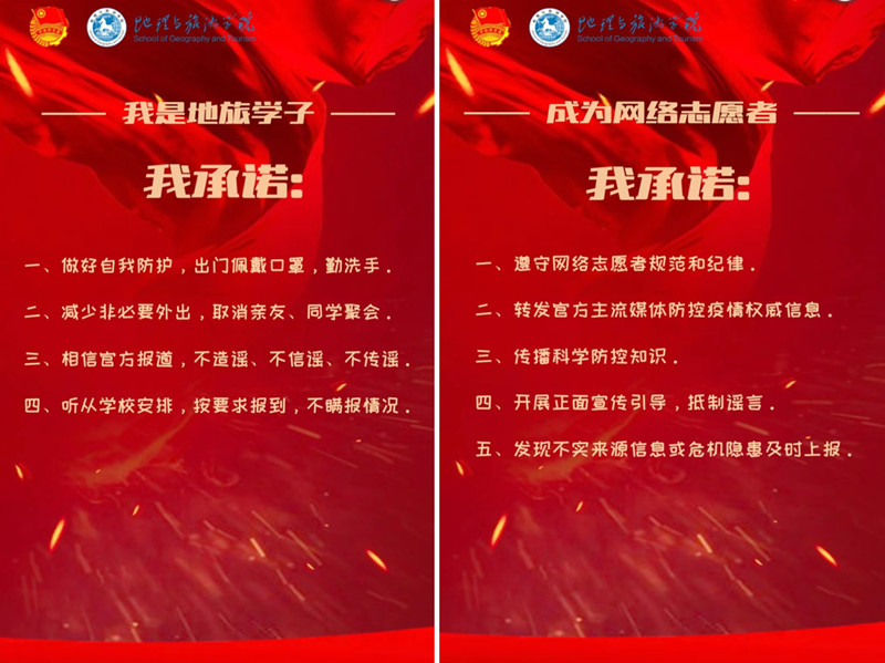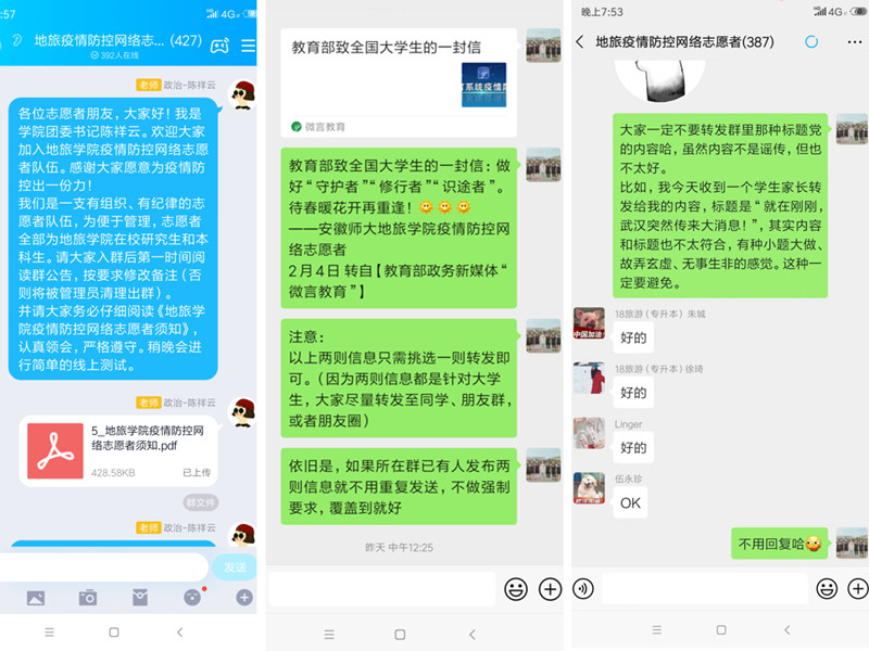 565net必赢客户端旅游本科生党支部书记、院团委书记陈祥云介绍:“我们要求志愿者们统一转发的信息,在选择时一定是慎之又慎。并且,为了体现内容规范性和可靠性,每条统一转发的信息都由我本人确定和发布,并要求志愿者按照统一格式配文,注明信息来源,亮明疫情防控网络志愿者身份。志愿者们也都积极响应、严格执行。‘规定动作’一定要做到‘有模有样’!”