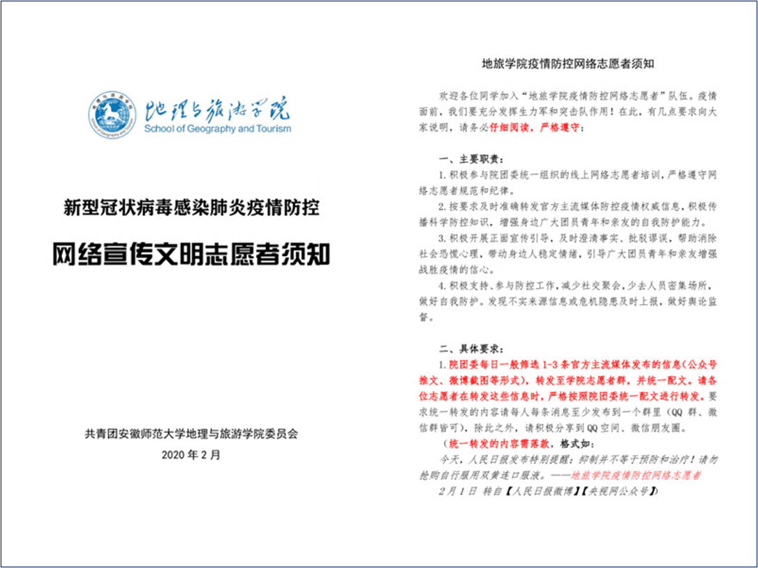 活动设置了严格的培训、监督和管理机制。学院团委统一为志愿者开展线上培训;发布《565net必赢客户端疫情防控网络志愿者须知》;实行组长负责制,按班级团支部设置小组,一般由党员或团支书担任组长,负责各组成员的管理、网络信息发布内容的监督等。活动中,学院明确要求学生党员和团员骨干要充分发挥模范带头作用,积极配合做好志愿者的动员组织和管理监督工作。