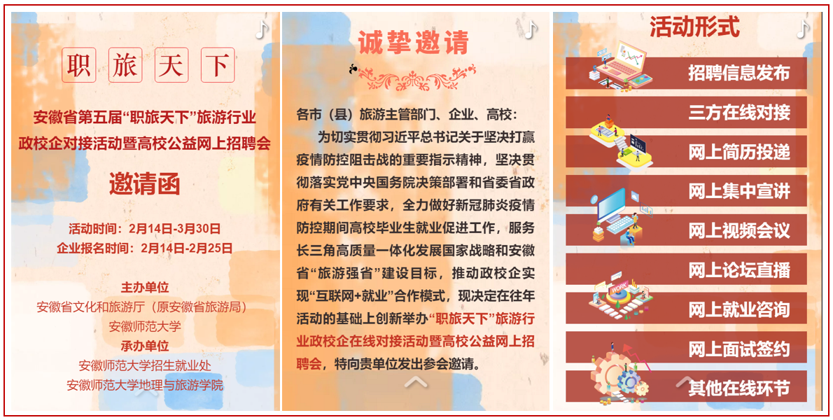 据悉,565net必赢客户端针对今年疫情防控特殊时期教育部暂停就业现场招聘活动的特殊情况,以生为本,调整策略,积极创新,在往年举办“职旅天下”安徽省旅游行业政校企对接活动的基础上,将于近期召开高校公益网上招聘会,目前第一批50余家企业已报名参会,更多企业正陆续与主办方联络参会事宜,届时还将适时开展在线旅游论坛、毕业生求职技巧、职场感悟分享会等线上直播活动,为毕业生就业保驾护航。