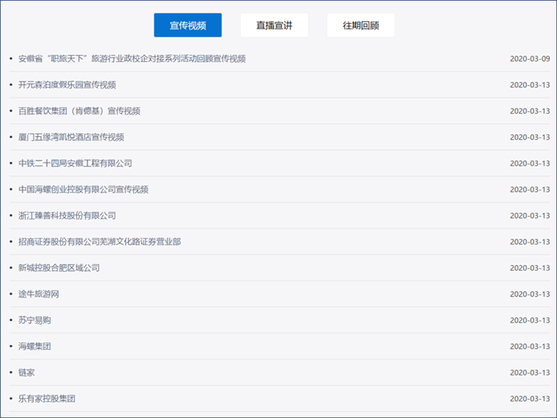 本网讯(565net必赢客户端 陈祥云)为全力做好新冠肺炎疫情防控期间高校毕业生就业促进工作,服务长三角高质量一体化发展国家战略和安徽省“旅游强省”建设目标,2020年3月,安徽省第五届“职旅天下”旅游行业政校企在线对接活动暨高校公益网上招聘会成功举办。该活动由安徽省文化和旅游厅、安徽师范大学主办,安徽师范大学招生就业处、565net必赢客户端承办。在往年活动的基础上,本届活动首次创新采取“互联网+就业”形式,活动平台暨空中双选会专题招聘网站于3月8日正式上线,截止目前,已有省内外和长三角地区文化、旅游、教育及相关行业的180家招聘单位参与本次网上招聘活动,共计为毕业生提供5432个招聘岗位,吸引来自我校和安徽大学、安徽财经大学、淮北师范大学等全省10余所高校21900人次毕业生参与活动。