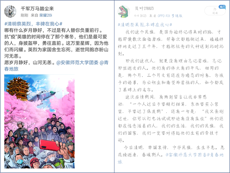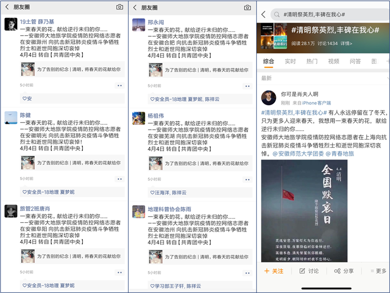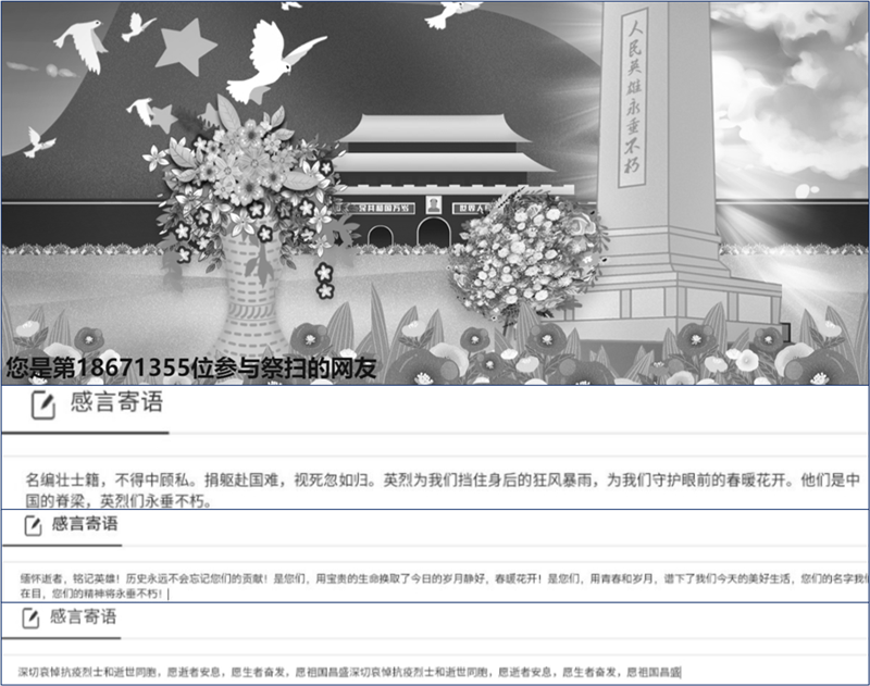 地旅团员青年通过个人微博、微信、QQ等方式讲英烈故事、说学习体会。565net必赢客户端疫情防控网络文明宣传志愿者们在各地为抗击新冠肺炎疫情斗争牺牲烈士和逝世同胞深切哀悼。