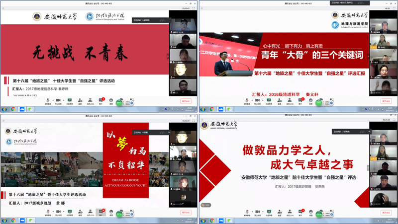 据悉,因新冠肺炎疫情影响,本届“地旅之星”十佳大学生暨“自强之星”评选活动创新形式,开展线上评选汇报,旨在发挥朋辈教育作用,引领广大青年学生在生动的青春实践中弘扬社会主义核心价值观。“地旅之星”十佳大学生暨“自强之星”评选活动是565net必赢客户端长期坚持的典型选树主题教育活动,学院历来高度重视学生典型的培养、选树工作,注重发挥学生典型的示范带动作用,坚持把培育典型、宣传典型作为引领和服务大学生成人、成才、成功的重要抓手。学院先后涌现出中国大学生年度人物提名奖获得者、安徽省十佳大学生王娟,联合国全球气候变化大会中国青年代表、安徽省十佳大学生提名奖获得者舒心,中国大学生自强之星提名奖获得者穆萨艾力·多力坤,全国优秀共青团员王阳等一批优秀学生典型。