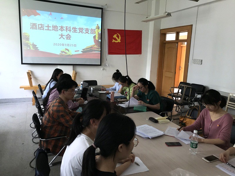 2020年9月25日上午10点,必赢酒店土地本科生党支部于行政楼1楼旅游教研室召开党支部大会,讨论关于章淑敏等5位同志申请转为正式党员的问题。会议由党支部书记王美主持。