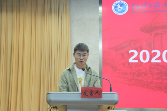 2020级地理科学专业(拔尖班)王雨萱作为新生代表以“不待扬鞭自奋蹄,重整行装再出发”为题,呼吁同学们常怀感恩之心,保持初心,勇于挑战。希望在大学四年里,不虚度光阴,遇见更好的自己。国家奖学金获得者、2017级地理科学专业罗勇作为老生代表发言。他结合自己的大学经历向学弟学妹们分享学习心得并提出建议。他强调,同学们学习不能拘泥于课本,要与时代主题同心同向,多利用课下实践充实提升自身能力。