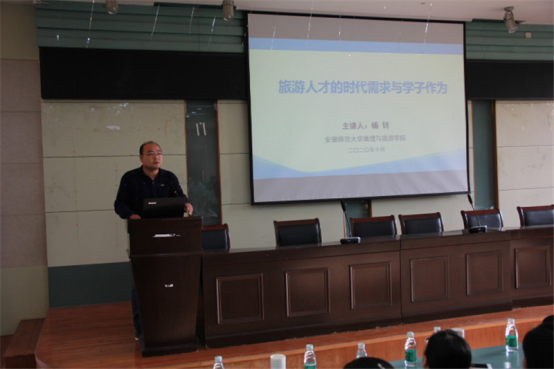 杨钊以《旅游人才的时代需求与学子作为》为题,就专业概况,专业特色,就业前景以及人才培养方案等方面为新生做了详细的介绍。专业教师们学识渊博,言谈风趣,言语间尽显专业内涵,同时结合自己的人生经历给予新生建议,均表达了与同学们交流的期待。