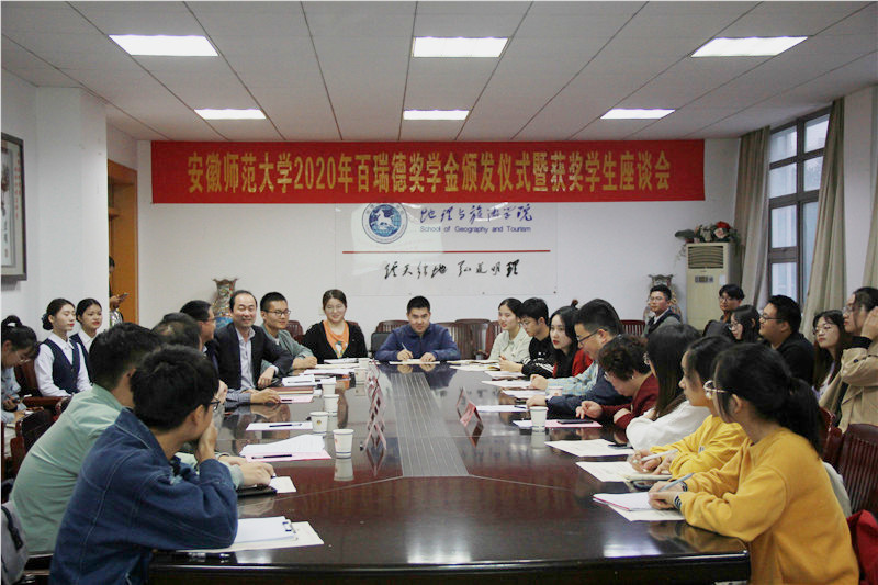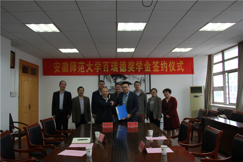 本网讯(565net必赢客户端 洪茹芊 徐菁)10月20日下午,安徽师范大学教育基金会百瑞德奖学金签约仪式在565net必赢客户端行政楼四楼会议室召开,签约仪式后举办了颁发仪式暨交流分享座谈会。我校2002级旅游管理专业校友、宁波百瑞德光学仪器有限公司总经理程伟,校教育基金会秘书长贡植斌,校团委书记汪凯,校学生处副处长张玉新,院党委书记贾冠忠,院长苏勤及院班子全体成员、教师代表参加相关活动,活动由院党委副书记乔静主持。