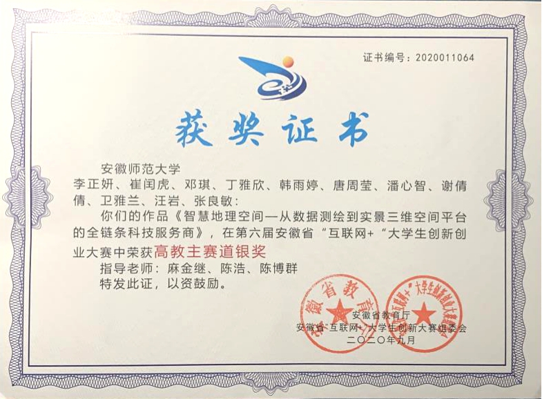 本网讯(地旅学院 李正妍)近日,由安徽省教育厅与合肥市人民政府联合主办,合肥工业大学、合肥学院、合肥职业技术学院和合肥市教育局共同承办的第六届中国国际“互联网+”大学生创新创业大赛选拔赛暨安徽省“互联网+”大学生创新创业大赛圆满落下帷幕。2017级地理信息科学专业李正妍、崔闰虎、2018级地理信息科学专业邓琪等同学,在我校565net必赢客户端麻金继教授、物电学院陈浩老师、创新创业学院陈博群老师指导下组队参赛。经过校级初赛、网络评选、线上路演三个环节的激烈角逐,最终获得了高教主赛道省级银奖。