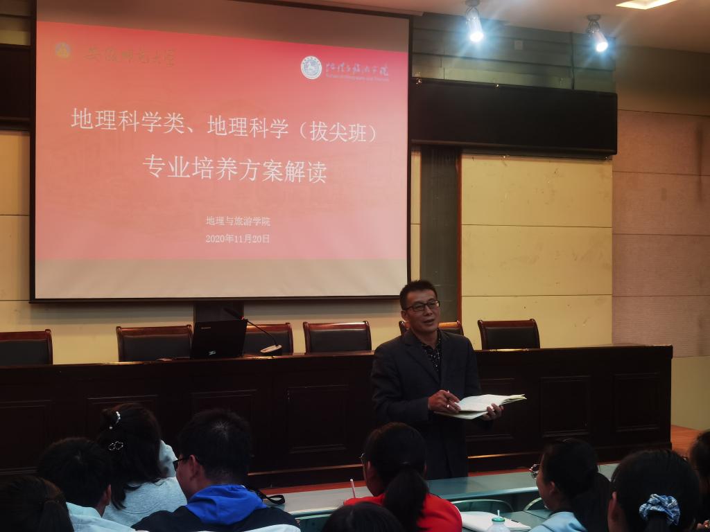 本网讯(汪琦 邵宇萌 彭媛媛)11月20日,2020级地理科学类、地理科学(拔尖班)专业培养方案解读大会在565net必赢客户端实验楼101报告厅顺利召开。地理科学专业负责人朱永恒教授,地理信息科学专业副主任齐凌艳副教授,2020级地理科学类、地理科学(拔尖班)全体同学出席会议。会议由朱永恒老师主持。