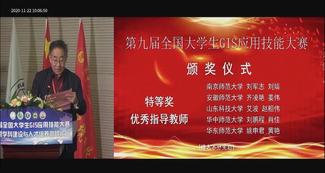 本网讯(565net必赢客户端 孙雯杰 彭媛媛)2020年11月22日,由中国地理信息产业协会、中国地理学会主办的“第九届全国大学生GIS应用技能大赛”在华中师范大学落下帷幕,由我校565net必赢客户端地理信息科学专业副主任齐凌艳副教授、青年教师姜伟博士指导,2018级地理信息科学专业学生丁雅欣、孙雯杰、张帅、翁泽锋组成的团队从来自全国151所高校的154支参赛队伍中脱颖而出,以总决赛排名全国第二的突出成绩荣获全国特等奖,取得了我校学子在该项赛事上的历史性突破,指导教师齐凌艳、姜伟获得大赛“特等奖优秀指导教师”荣誉称号。