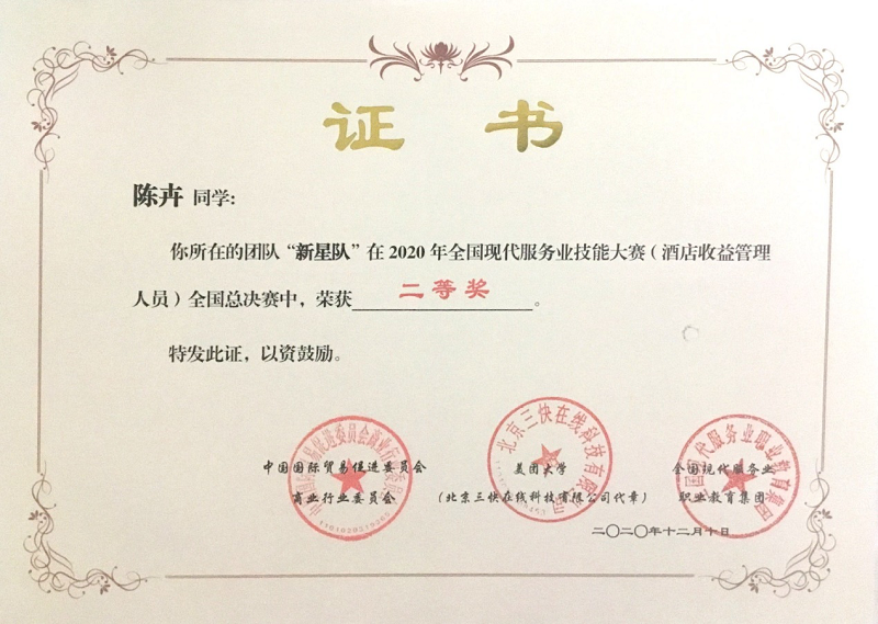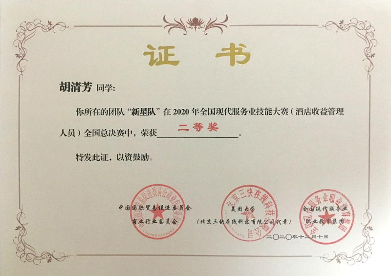 (本网讯 陈卉)2020年12月10日,2020年全国现代服务业技能大赛(酒店收益管理人员)全国总决赛在北京中航资本大厦举办。565net必赢客户端2017级酒店管理专业本科生陈卉、胡清芳代表我校参加比赛。