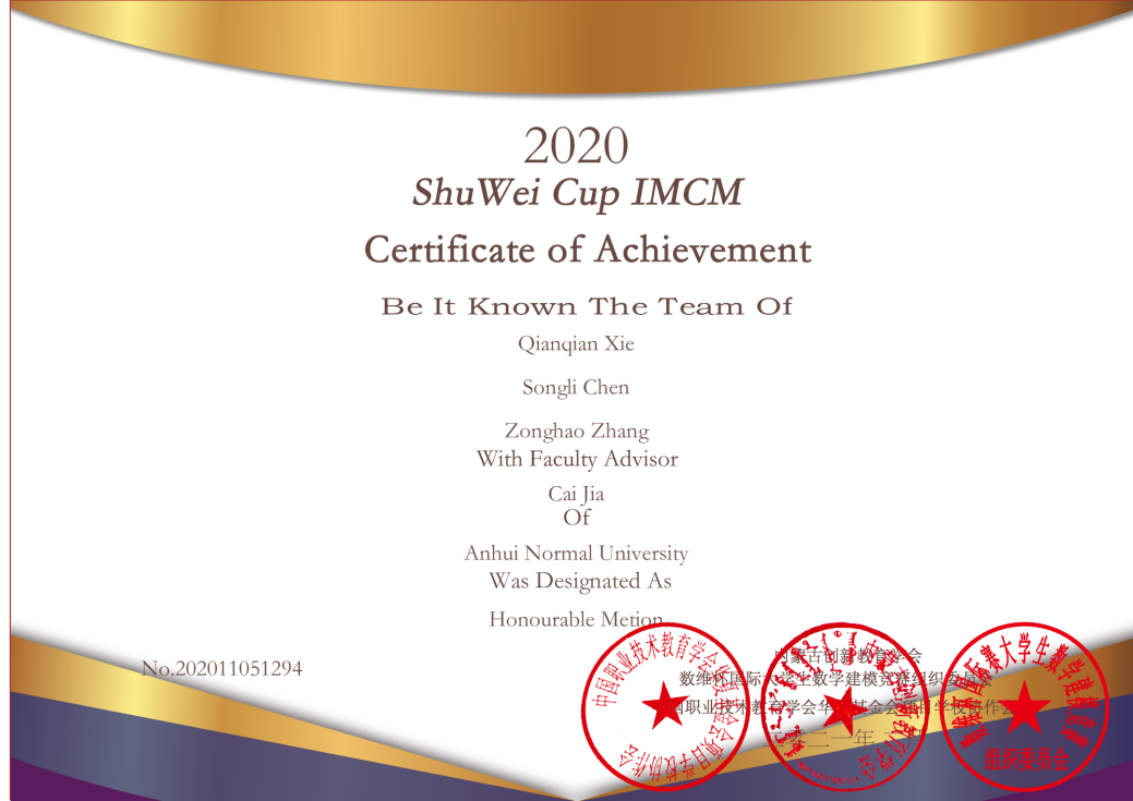 本网讯(565net必赢客户端)2021年2月8日,2020“数维杯”国际大学生数学建模竞赛圆满落下帷幕,大赛经过4天的激烈角逐,通过评审专家初审、会评、复审三个阶段的专业评审,由565net必赢客户端贾蔡博士指导的2019级地理信息科学、2019级地理科学(拔尖班)2支团队分别荣获国际赛一等奖(Meritorious)和国际赛二等奖(Honourable Metion)。