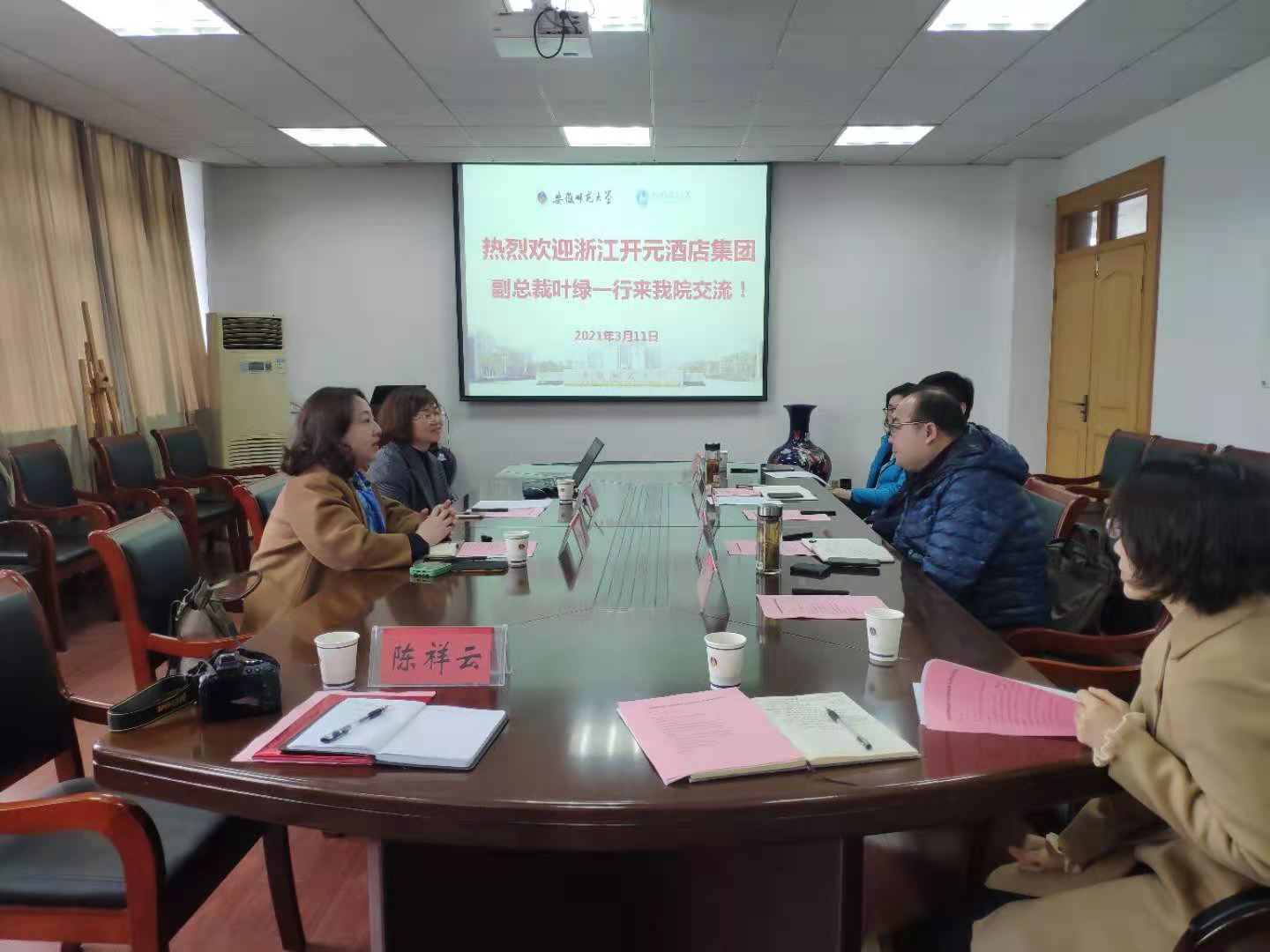 本网讯(565net必赢客户端 陈祥云)为积极探索校企合作新模式,推进学校旅游管理、酒店管理专业人才培养,565net必赢客户端与开元酒店集团积极推进双方战略合作。2021年3月11日,开元酒店集团副总裁叶绿女士、开元酒店集团人力资源部招聘经理黄素梅女士来我校洽谈合作对接事宜,565net必赢客户端党委书记贾冠忠、院长苏勤、党委副书记乔静、副院长曹卫东,旅游管理专业负责人杨钊、酒店管理专业负责人尹寿兵,学院团委书记陈祥云,以及专业教师代表出席本次合作洽谈活动。
