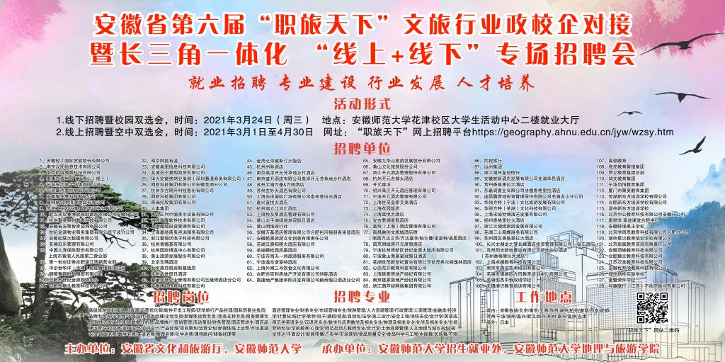 据悉,“职旅天下”系列活动自2013年创办至今,已吸引800余家文化、旅游及相关行业知名企业,3万余人次毕业生参与,推进了安徽省旅游院校与政府、企业的交流融合,校地合作、校企合作、“洲际”英才学院、“开元”订单班等一批政校企合作项目开花结果,一批创新创业项目和教学成果奖项应运而生,积极推动了各高校旅游及相关专业毕业生就业工作。“职旅天下”活动已成为安徽省乃至华东地区“起步最早、规模最大、影响最广”的高校旅游行业政校企合作重要平台和就业品牌之一,活动相继受到新华网、国家旅游局官网、《中国旅游报》《安徽日报》等新闻媒体的广泛报道。今年,为主动应对新冠肺炎疫情防控形势,积极响应教育部有关工作要求,活动首次采取“线上+线下”同时进行的形式举办高校文化和旅游专场招聘会,助力疫情防控常态化背景下的高校就业工作,服务长三角高质量一体化发展国家战略和全面建设现代化五大发展美好安徽奋斗目标。