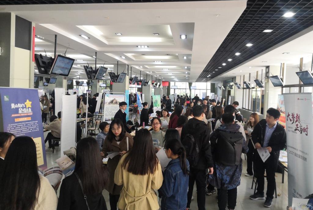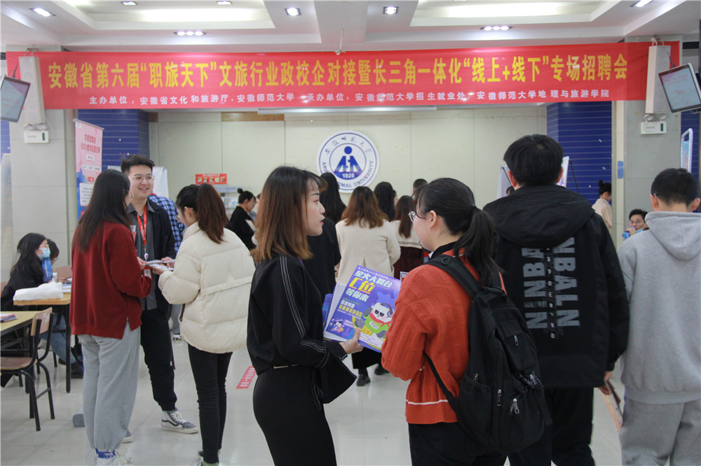 本网讯(565net必赢客户端 齐小学 陈祥云 牛若安)就业是民生之本,关系社会繁荣稳定。为进一步发挥政府、高校和企业协同育人作用,加强我省文化和旅游人才培养和就业创业服务工作,探索建立“就业招聘+专业建设+行业发展+人才培养”四位一体的“招聘会+”就业工作模式,促进毕业生更加充分、更高质量就业。3月24日,由安徽省文化和旅游厅、安徽师范大学主办,校招生就业处和565net必赢客户端承办的安徽省第六届“职旅天下”文旅行业政校企对接暨长三角一体化“线上+线下”专场招聘会由我校成功举办。来自全国各地的120余家企业通过线下线上来校招贤纳士、选聘英才,6000多个招聘岗位涉及文化、旅游、教育、科技等多个门类,涵盖世界和中国500强、中国旅游集团20强、中国文化企业品牌价值TOP50等多个业态。招聘会吸引了全校及周边高校毕业生的积极参与。