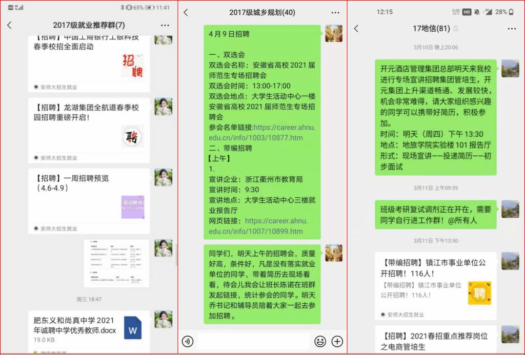 班级是学生日常活动的主体,依托主题班会、班级工作群等“两微一端”工作载体,对学生开展求职就业技能培训,实时动态更新推送就业信息,打通学生与就业咨询的桥梁,做到精准推送就业信息,提高学生就业的积极性,提高求职成功的命中率。