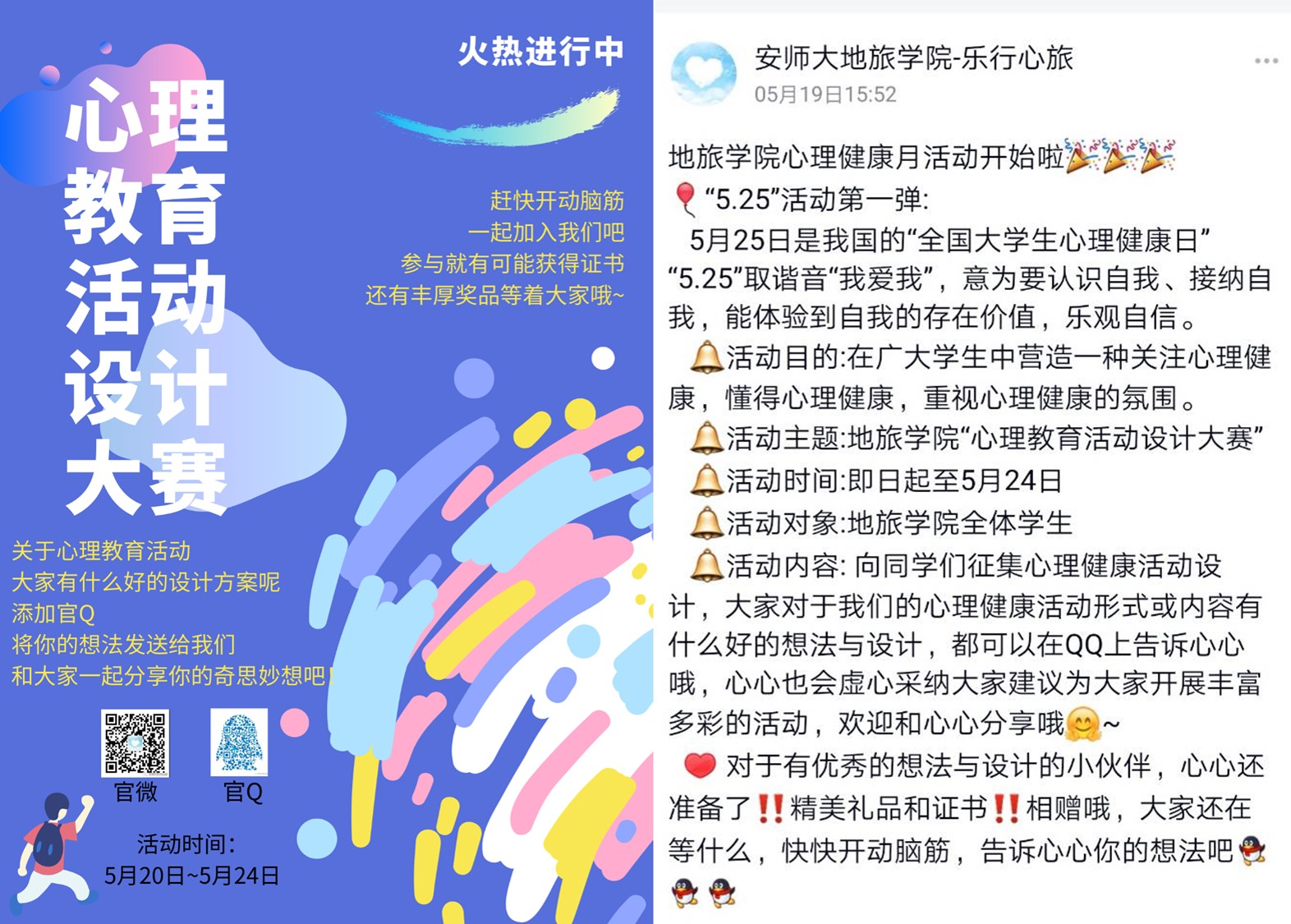 为在广大同学中营造一种关注心理健康,懂得心理健康,重视心理健康的氛围,丰富心理健康教育活动的形式,提高同学们心理健康教育活动的参与度和满意度。565net必赢客户端“乐行心旅”心理发展辅导站组织开展了心理健康活动设计大赛,同学们积极响应、踊跃报名,官Q账号收到大量创意方案投稿,有利于营造出学院积极、健康、和谐的心理健康教育氛围,引导学生树立正确的心理健康观念,以更积极的心态投入到学习和生活中。