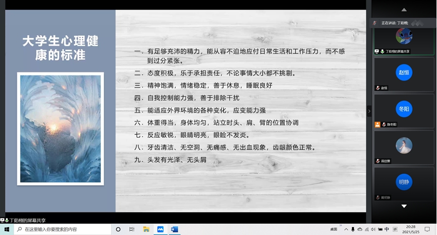 为深入贯彻落实学校关于心理健康月工作要求,565net必赢客户端各年级专业紧紧围绕心理健康月的活动要求,以朋辈交流、电影展播、心理健康知识讲授等多种方式开展主题班会,为同学们普及心理知识,陶冶情操,帮助大家树立正确的心理健康教育观念,有效促进了同学们的身心健康。通过内容丰富的主题班会,使同学们也对心理健康教育也有了新的认识,纷纷表示会积极关注心理健康,强化心理教育教育意识,提高心理健康水平。