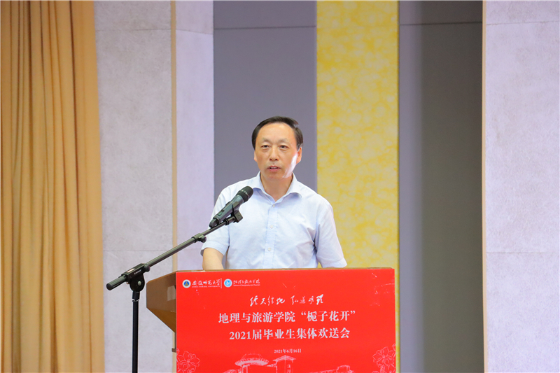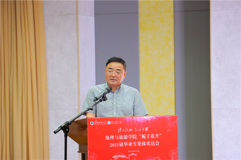 安徽省教学名师、地理科学专业教授焦华富作为教师代表发言,他分别从个人与国家、责任与担当、文明与体魄、情商与智商四方面寄语毕业生,希望他们可以为中华民族伟大复兴而不断拼搏、不断努力,以出色的成就为母校母院增光添彩。