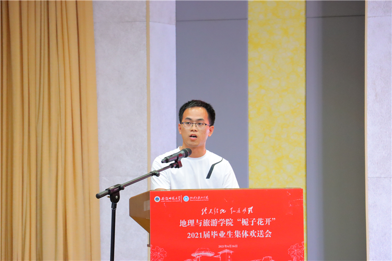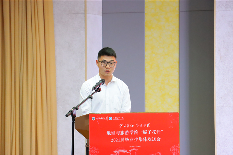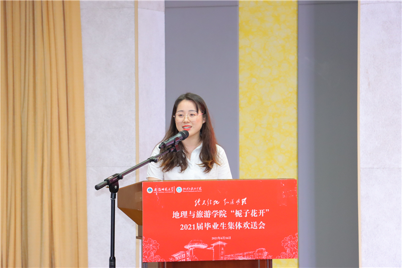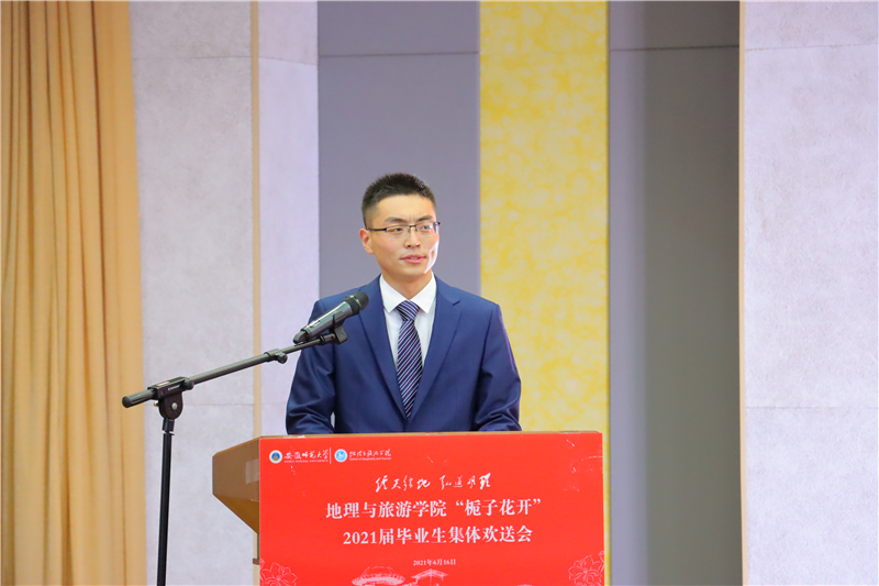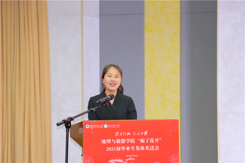 暖风春晖、日日铭怀;桃李不言,下自成蹊。欢送会上,毕业班辅导员为毕业生送上离别寄语。2017级地理科学、旅游管理、酒店管理、土地资源管理专业辅导员王美在寄语中表达了对同学们的关心与不舍,引导毕业生在今后的工作生活中爱己爱人、悦纳自我。2017级城乡规划专业辅导员齐小学在寄语中细数与同学们一起经历的点点滴滴,鼓励同学们在毕业后保持对生活的热爱、永远不要停止学习。2017级地理信息科学专业辅导员韩红豆在寄语中表达了对毕业生的叮咛与嘱托,希望同学们谨记老师们的谆谆教诲,心里有火,眼里有光。