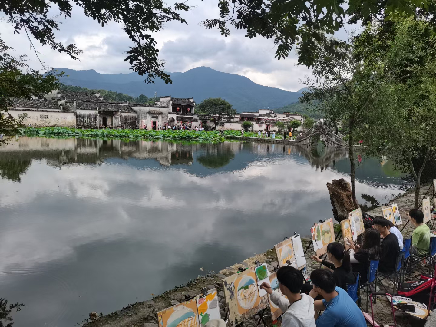 7月6日初到宏村,老师安排导游带领同学们从文化底蕴和自然风化的宏观层面把握宏村,产生一个总体了解和认识。接下来的几天里,同学们的画笔从南湖边描绘到村中街巷,从湖边绿荷、湖上石桥,刻画到粉墙黛瓦、精致牌坊……水墨江南画,逐渐从眼前,流转到笔下、到心里。每日晚餐后,同学们都会聚集在专业老师周围听取点评,了解自己的优点和不足,并在接下来的实习中不断通过练习进行强化。金莹莹也鼓励大家敢于下笔、勇于着色,在大胆尝试中摸索自己的绘画风格,放松线条,追求进步。