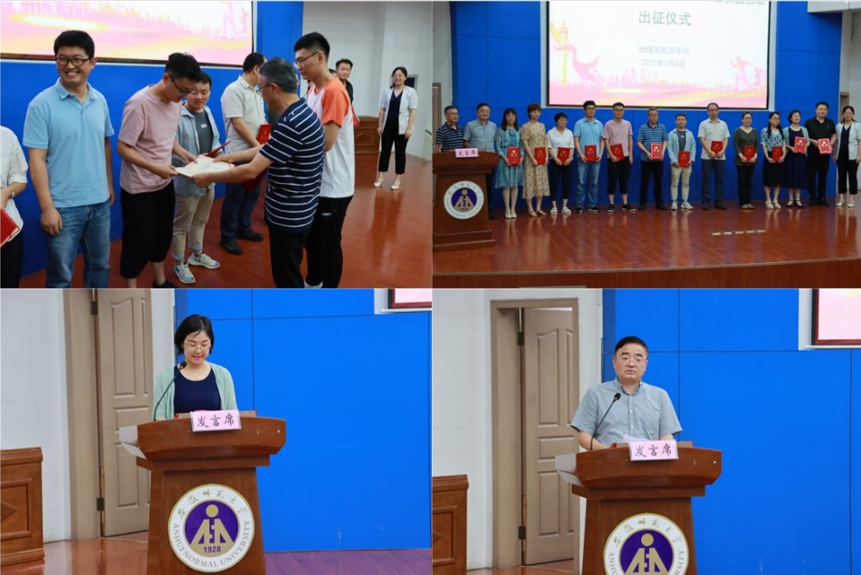 本网讯(565net必赢客户端 薛乃基)永远跟党走,奋进新时代。7月8日下午,565net必赢客户端2021年大学生暑期“三下乡”社会实践活动出征暨授旗仪式在敬文图书馆学术报告厅举行。校团委副书记张薇薇,暑期社会实践思政指导教师孙艳秋,院党委书记贾冠忠,院长苏勤,院教授委员会主任程久苗,院党委副书记乔静,副院长方凤满,副院长曹卫东,副院长汪文文,院暑期社会实践团队指导老师代表王群、方叶兵、徐玉婷、王雪微、韩会然、张伟、王莉、姜伟、朱爱萍、朱晓强,以及全体专兼职辅导员、全体暑期社会实践团队队员参加了出征仪式。仪式由院团委书记陈祥云主持。
