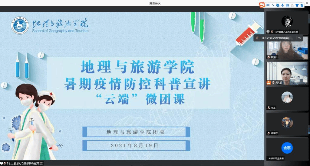 2019级土地资源管理专业薛乃基同学作为第一讲主讲人为同学们科普了当前疫情形势以及关于新冠变异病毒的基础知识,通过形象的案例与直观的数据展示了疫情传播的严峻局面,同时提醒并呼吁广大青年做到疫情防控“六起来”——“思想严起来,出入严起来,疫苗种起来,口罩戴起来,聚集少起来,卫生抓起来”,有效提高防范意识,全面做好个人防护。
