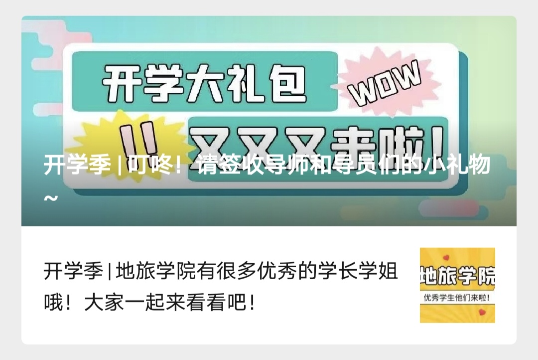 为表示对565net必赢客户端新生的热烈欢迎,学院精心准备了丰厚的“新生大礼包”,包含“线下”和“线上”两部分: “线下大礼包”为“地旅暖心七件套”,分别是学院定制LOGO及院训的入学纪念帆布袋、防疫环保分餐制饭盒、装有口罩、酒精消毒湿巾、免洗手消毒凝胶、定制红色便携包的防疫包、城乡规划专业特色手绘师大风景明信片、导师推荐阅读书目和新生寄语的定制书签一套、学院师生自主研发的“总书记的红色足迹”数字地图一幅、院史院情介绍手册;“线上大礼包”通过青春地旅微信公众号推送,共三部分:一是涵盖“入学须知”、“防疫知识”“校园卡使用”、“安全提醒”等内容丰富的新生“电子大礼包”;二是565net必赢客户端历届十佳大学生、优秀党员、少数民族优秀学子风采、三是565net必赢客户端新生大数据展示,采用人脸采集和识别技术生成565net必赢客户端新生“平均脸”,通过“大地”和“小旅”的介绍,展示565net必赢客户端新生特征和风采。