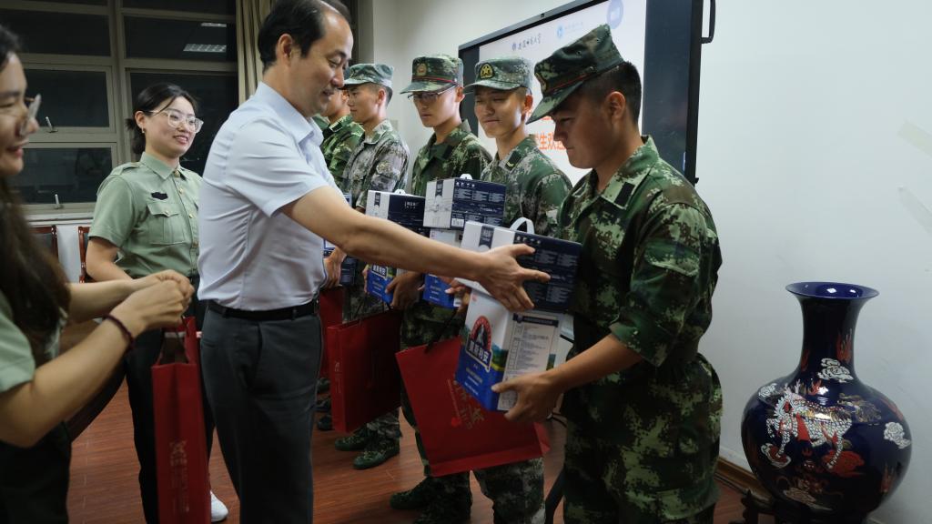 首先,退伍复学同学分别就在部队的收获与成长展开交流,纷纷表示部队服役两年的经历,既是对身体上的历练,也是对精神上的磨炼,同时更是思想政治觉悟的提升。接着,乔静代表学院对退伍复学的同学表示欢迎,对他们携笔从戎、保家卫国的人生选择表示肯定,并勉励他们在回到校园后继续发扬艰苦奋斗、勇往直前的精神,刻苦努力学习,争当五育并举的青年表率。最后,恰逢中秋、国庆双节,乔静代表学院对参与新生军训的教官送上节日问候,并发放节日慰问品,希望在接下来的新生军训中各位助训教官继续努力,争取军训工作再创佳绩。