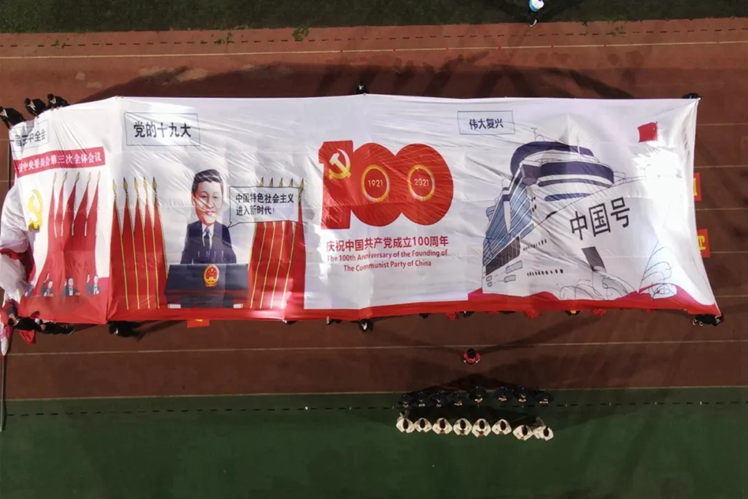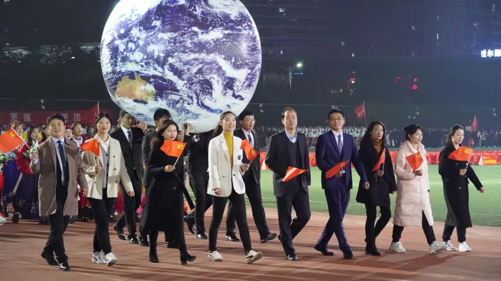 紧随着红旗方队,565net必赢客户端作为学院方针队展示组第一个入场,以热情饱满的姿态向全校师生展示地旅学子昂扬挺拔的身姿,铿锵有力的步伐。“经天纬地,弘道明理。地旅学子,所向披靡”,响彻全场的口号昭示着地旅必胜的决心。主席台前,地旅学子协同合作将一幅壮阔娟丽的党史图卷徐徐展开,展示蓬勃生机和青春朝气;富有专业特色的荧光地球被高高举起;身着绚丽服饰的少数民族同学别具一格,载歌载舞,彰显了民族同心的和谐气象;礼仪队的红色旗袍流转光华,与高高的党徽遥相呼应。在党成立100周年,565net必赢客户端以饱满自信的精神面貌做出“请党放心,强国有我”的承诺,向党组织和学校展示了新时代青年的使命担当。