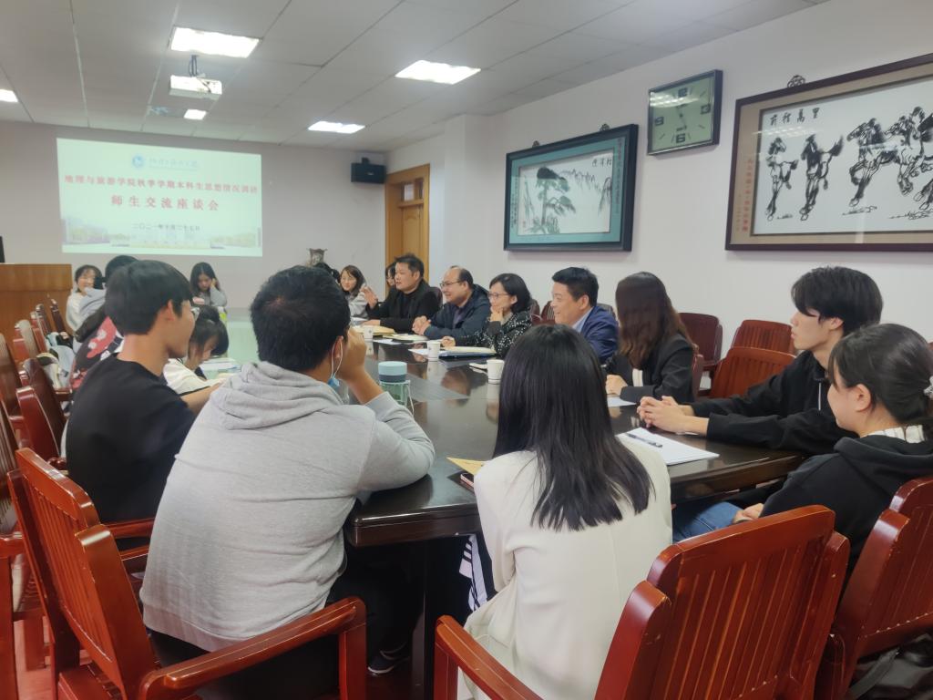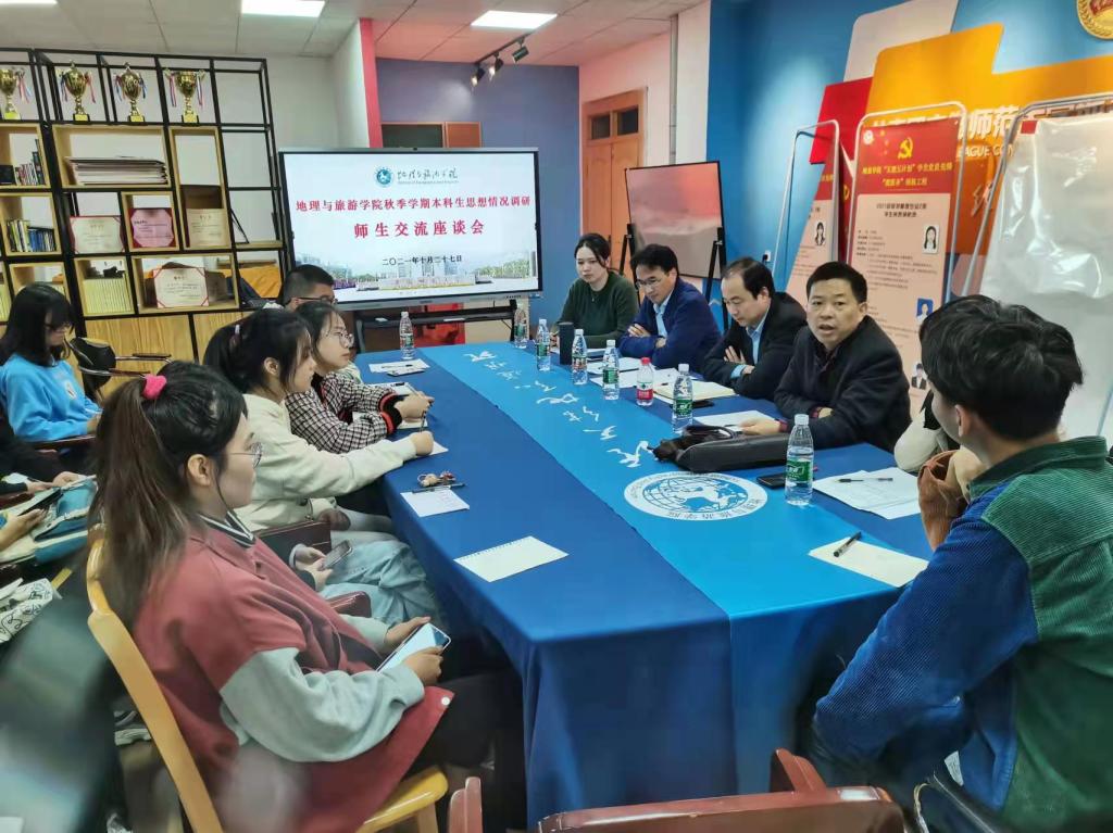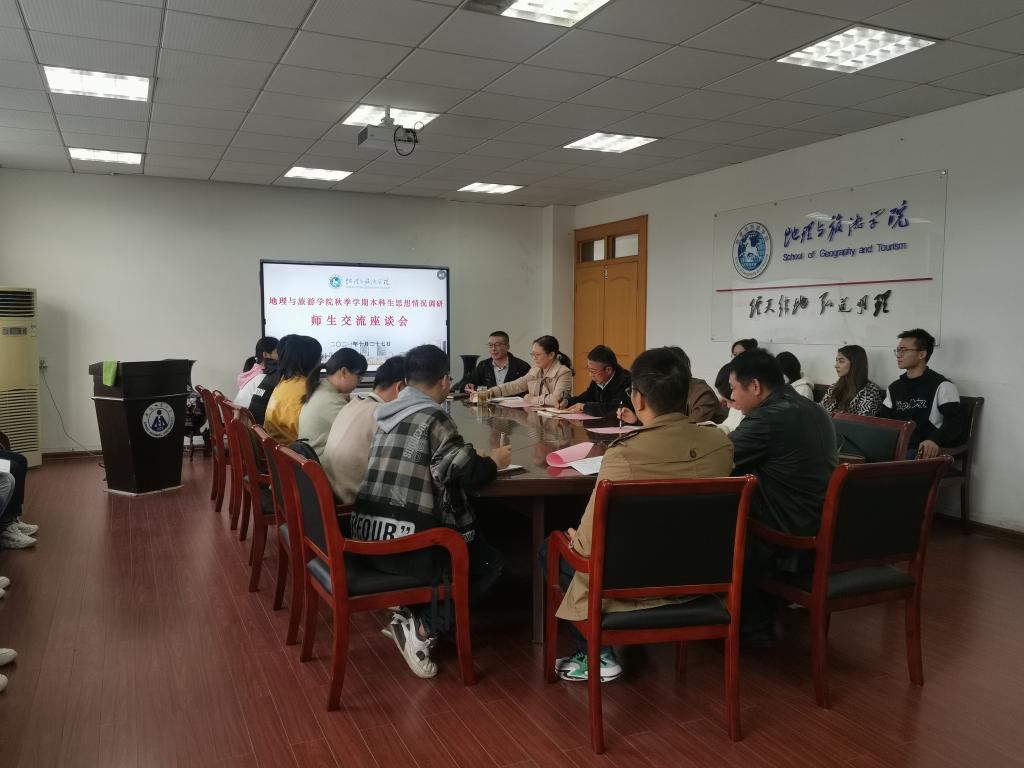 本网讯(565net必赢客户端 齐小学)为及时了解秋季学生思想状况,研究解决学生在思想、学习和生活等方面存在的实际问题,有针对性地做好学生教育管理和服务工作。10月27日下午,565net必赢客户端于学院行政楼举行了“经纬心声”本科生思想情况调研暨师生交流座谈会,座谈会根据专业划分为地理土地、旅游酒店、地信城规三个分会场。565net必赢客户端领导班子成员、各专业负责人、教师代表、专兼职辅导员以及学生代表按专业分会场参加座谈会。