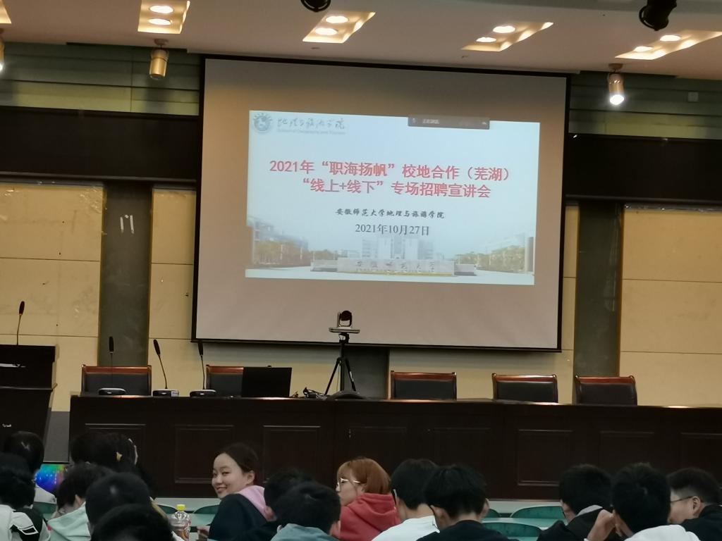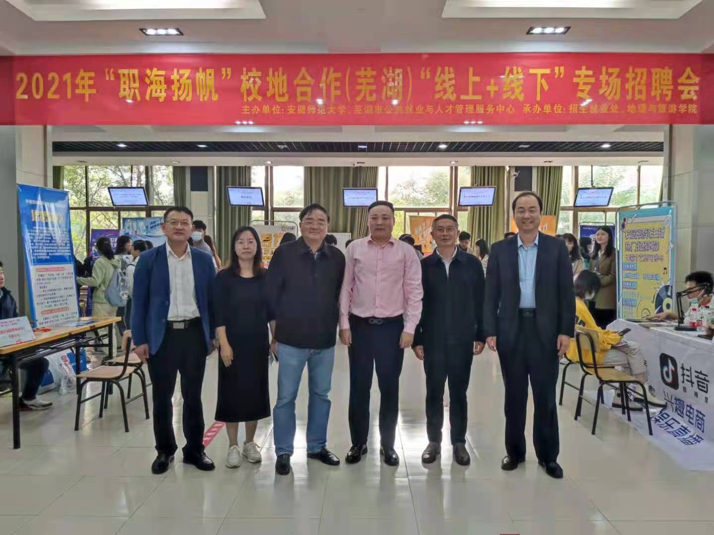 本网讯(565net必赢客户端 齐小学 许晓玉)就业是民生之本、发展之基,关系社会和谐稳定、学校人才培养。为促进毕业生更加充分、更高质量就业。10月27日下午,由安徽师范大学、芜湖市公共就业和人才管理服务中心主办,招生就业处、565net必赢客户端承办的安徽师范大学2021年“职海扬帆”校地合作(芜湖)“线上+线下”专场招聘会成功举办。来自京沪苏浙皖等地的科大讯飞、海螺集团、国美电器集团等世界和中国500强企业,以及安徽省旅游规划设计研究院、安徽省城建设计研究总院、安吉县教育局等119家优质企事业单位应邀参会,其中线下招聘单位60家,1100多个招聘岗位涉及文化、教育、设计、科技等多个门类。招聘会现场和线上招聘平台吸引了全校毕业生的到来。