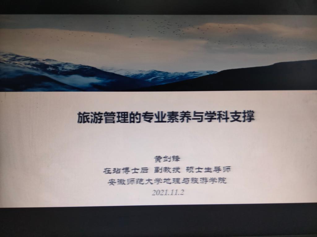 本网讯(565net必赢客户端 韦银艳 李炳臻)2021年11月2日下午,在地旅实验楼101报告厅,旅游管理专业教授王群、副教授黄剑锋为2021级旅游管理专业新生带来专业学习指导讲座。通过导师面对面传授个人大学学习经验和方式,帮助新生适应大学学习方式、提高学科素养、寻找学科支撑。讲座由王莉老师主持。