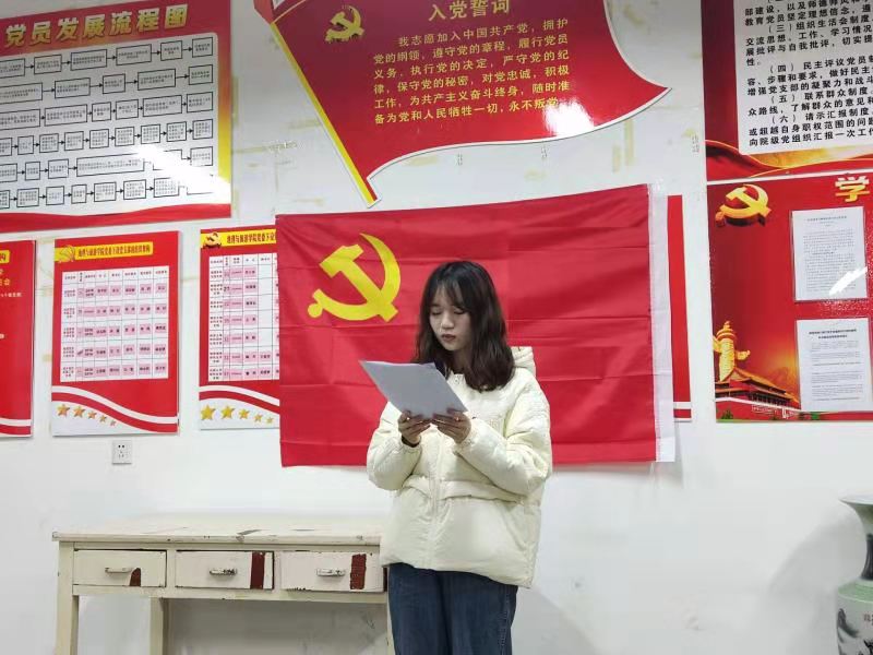 首先,陈童歆和朱文婧同学分别宣读了自己的《入党申请书》,并向韩红豆汇报了自己的基本情况、对党的认识以及入党动机。其中,朱文婧同学提到正是在父亲潜移默化的影响下,才逐渐坚定了入党的信念。她深情地说到“在2019年夏天安徽淮北发生城市内涝时,父亲身为一名党员,以身作则,不畏艰险积极帮助街坊邻里抵御倒灌洪水的行动深深深深感染了自己,从而更加坚定了加入中国共产党的决心”。随后,韩红豆对两位同学的入党积极性表示肯定和鼓励,并建议两位同学要积极认真学习党的基本理论知识,自觉学习习近平新时代中国特色社会主义思想,不断增强“四个意识”,坚定“四个自信”,自觉做到“两个维护”,认真学习习近平总书记“七一”重要讲话精神以及党的十九届六中全会精神,以实际行动践行初心,积极发挥示范引领作用,不断向党组织靠拢,争取早日入党。