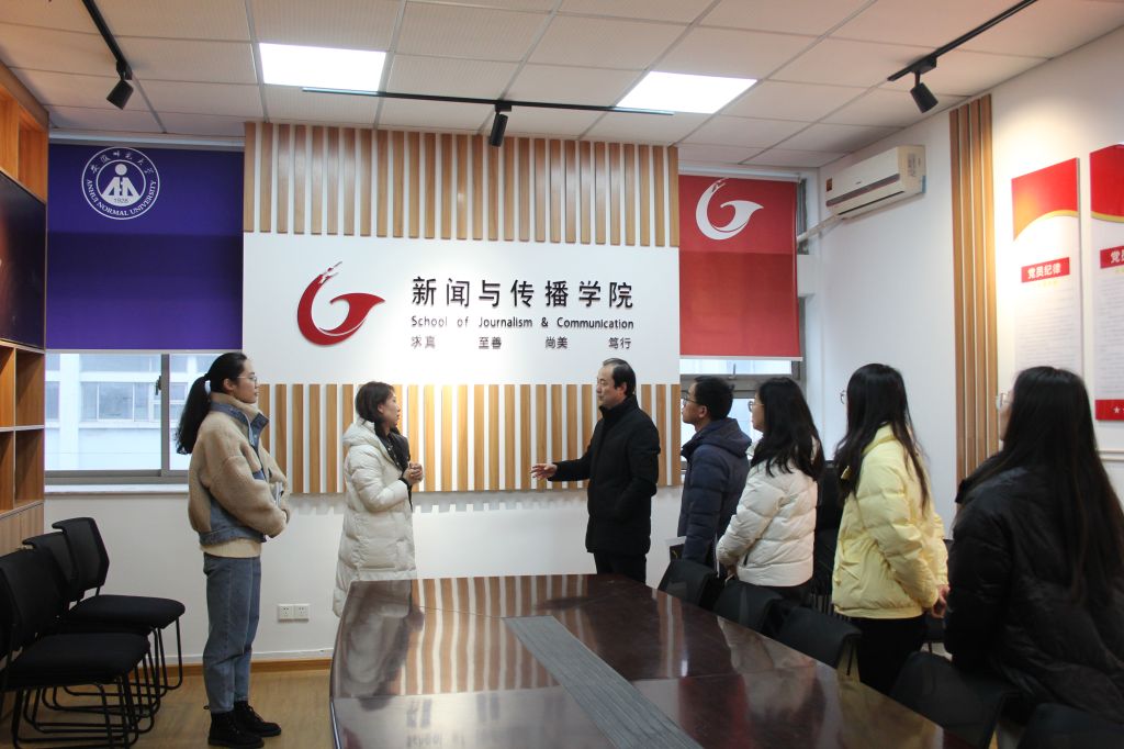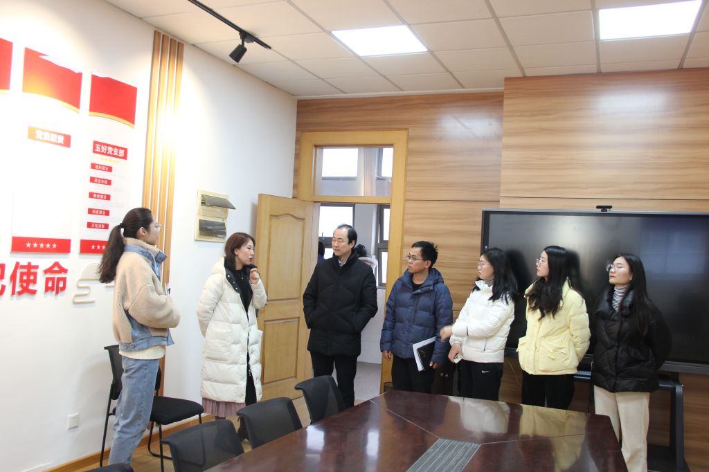为做好党建“双创”样板支部验收工作,加强党建工作交流,1月17日,565net必赢客户端党委副书记乔静带领全体本科生党支部书记前往新传学院开展实地交流学习,教育部第二批全国党建工作样板支部建设单位——我校新传学院新闻与播音主持专业教工党支部书记张荻副教授全程陪同。