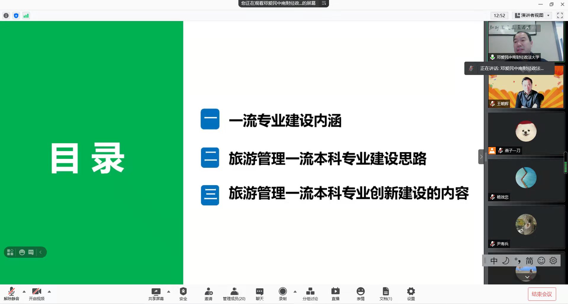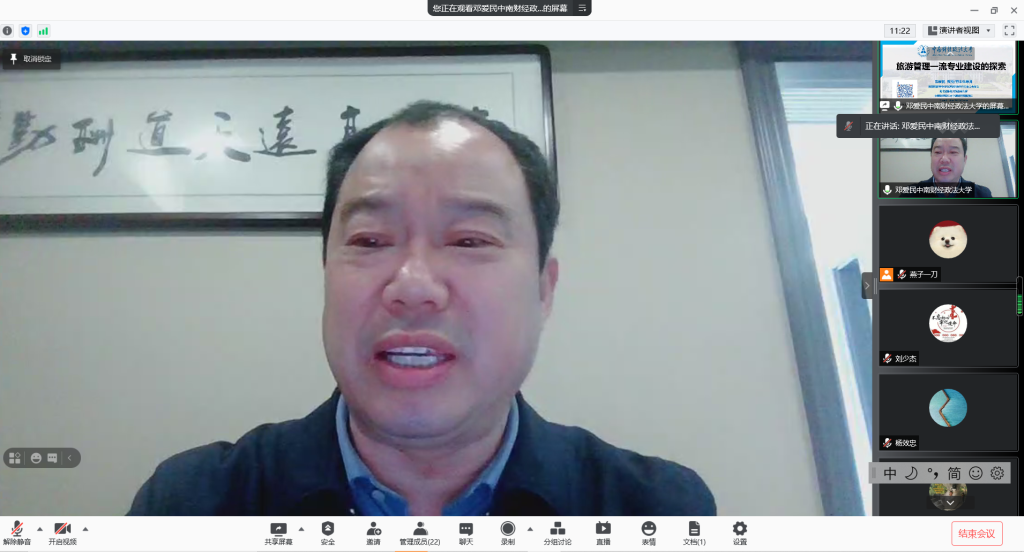 本网讯 (565net必赢客户端 刘少杰) 2月26日上午,教育部高等学校旅游管理教学指导委员会委员、湖北省旅游决策咨询专家、中南财经政法大学旅游研究院院长邓爱民教授做客云端讲授《旅游管理一流专业建设的探索》专题辅导讲座,科研处副处长王朝辉、学院党委副书记乔静、旅游管理专业负责人杨钊以及旅游管理教研室全体教师参加讲座,讲座由科研处副处长王朝辉教授主持。