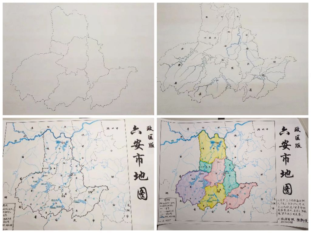 一等奖作品获得者、旅游管理专业的张新悦同学讲述了自己的绘图过程:“在手绘六安市地图时,我首先根据官方地图用铅笔对照画出轮廓,将四县三区画出区界,然后把市内及周围城市的主要河流画出来,彩色铅笔加重区域边界,最后上色。上色时要顺着一个方向一鼓作气涂写,防止色块堆叠;河流有宽有窄,需要用笔的粗细来勾勒;省边界、市边界和区边界样例相似但不同,很容易画错,所以要仔细对照勾勒。”