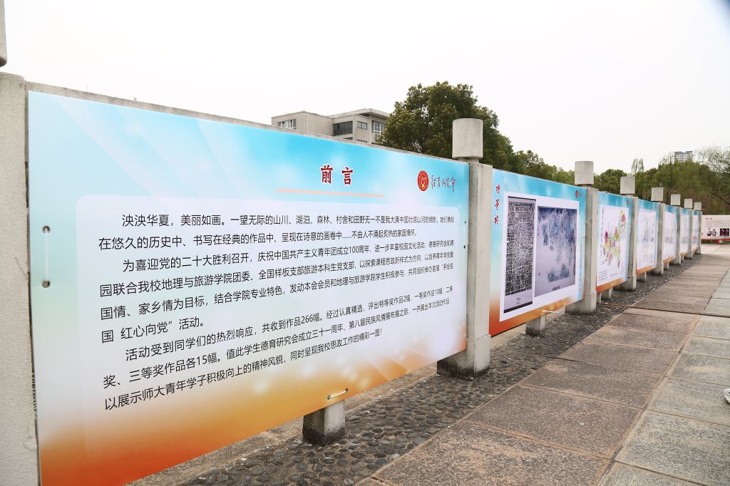阳春三月,春暖花开。花津河畔,人来人往的九曲桥上多了一道靓丽的风景线。近看,那明亮的色彩、流畅的线条、蜿蜒的河流、纵横的山脉组成了一幅幅精致的手绘地图,这些手绘地图作品有序陈列,引来许多师生的驻足参观。这正是由校团委、565net必赢客户端团委、马克思主义学院团委以及德育研究会联合举办的首届大学生“手绘祖国 红心向党”课程思政优秀手绘地图汇展活动(以下简称“‘手绘祖国 红心向党’活动”)的现场。