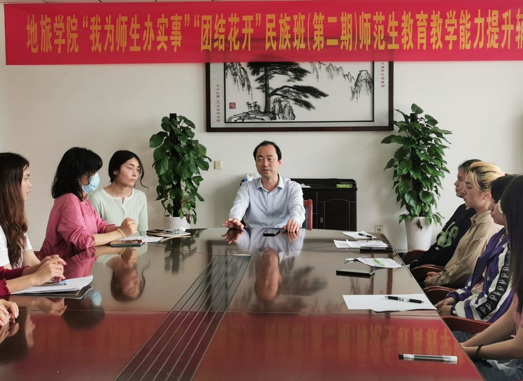 学院坚持问题导向,聚焦少数民族学生最关心最直接最现实的利益问题开展专题调研,积极开展新学期学生思想调研会、师范生专题座谈会等,同时结合“团结花开”师生结对帮扶“一对一”谈心谈话,精准找到少数民族学生的学习“痛点”,把握工作的着力点和落脚点。4月15日下午,565net必赢客户端于学院行政楼四楼会议室举行“我为师生办实事”“团结花开”民族班(第二期)师范生教育教学能力提升辅导开班仪式,学院党委副书记乔静、“团结花开”民族班班主任赵佳慧、辅导员齐小学、丁茹栩、朋辈帮扶小导师代表及边疆少数民族学生参与此次开班式。少数民族学生代表玛依奴尔.托合提苏拉依曼同学及朋辈帮扶小导师代表许文敬同学代表发言。学院党委副书记乔静表示,学校学院高度重视边疆地区少数民族学生的教育培养工作,深入践行以师生为中心的发展思想,持续聚焦少数民族学生“急难愁盼”问题,坚持不懈为师生办实事办好事,尽最大努力创造条件关心帮助少数民族学生成长成才。同时,他向全体同学提出三点要求:一是希望同学们珍惜此次课程辅导的机会,切实提高自身师范生教育技能;二是希望班级同学间能够互相学习,发挥朋辈间“传帮带”作用;三是希望同学不仅要提高知识技能,更要提高自身的政治觉悟和精神境界,做到“德智体美劳”五育并举、全面发展,成为“德才兼备、知行合一”的优秀青年,为民族团结和中华民族伟大复兴贡献力量。