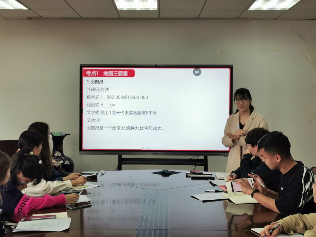 此次辅导班开设了自然地理、教学设计、笔试模拟、面试模拟四个专题的教学课程,为期三周,共计40课时。在正式开始培训前,学院多次召开提前摸排摸底会议、备课研讨会议、课程设计准备会议等,确保辅导班顺利开展。此次授课培训紧紧抓住理论教学和技能培训两方面,自然地理专题课程的设计注重理论教学,夯实同学们的专业知识基础,教学设计的培训,旨在提升同学们的师范生基本功,夯实从教技能,用扎实本领站稳三尺讲台。笔试、面试模拟课程则抓住同学们的实际需求,让学生提前适应教师资格证考试的答题规则,避免考生在考试时出现类似的错误,达到“以考促教”、“以考促学”的目的。4月26日上午,在学院三楼、四楼会议室分批举行了模拟面试,17位学员依次参加模拟面试,熟悉整体面试流程,小导师们对学员们进行一对一面试指导,学院党委副书记乔静、辅导员丁如栩全程参与模拟面试,并就同学们模拟面试中的表现予以点评指导,并勉励同学们树立自信,从容应考,充分发挥培训成效,以良好的精神面貌和扎实的知识技能在即将开展的教师资格证校内考试中创造好成绩。