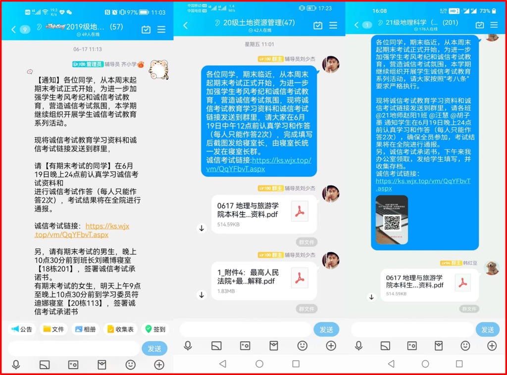进行在线宣传,营造学生诚信考试氛围。进一步推进学生考风考纪教育,学院召开期末学生考试诚信教育专题会议进行布置,要求各年级专业辅导员通过QQ、微信等网络新媒体,开展线上专题教育,切实把考风考纪工作抓在手上、落到实处,有效提高了同学们的思想认识,端正了考试态度,营造了诚信考试、诚实做人的氛围。