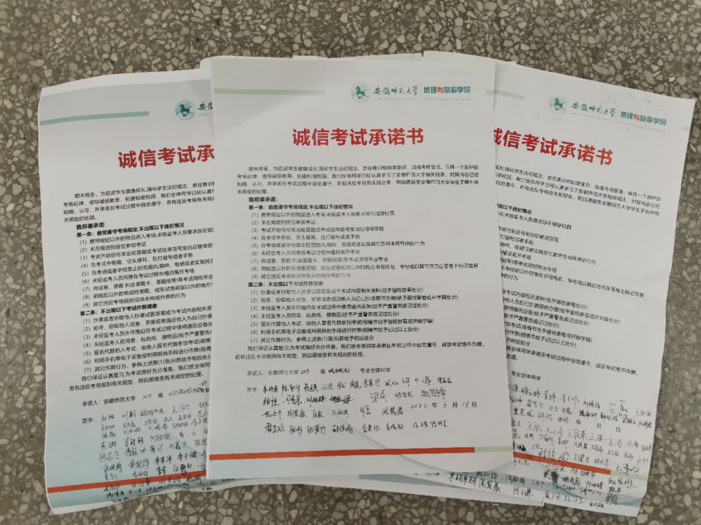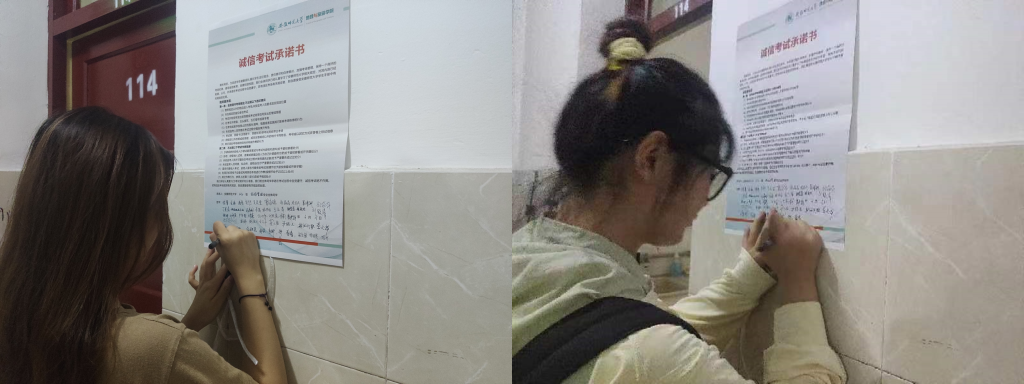 承诺诚信考试,规范学生诚信考试纪律。进一步实现“零作弊、零违纪”的目标,学院各班级在传达学校、学院诚信考试文件精神的基础上,所有学生认真阅读了诚信考试承诺书,对个人、班级、学院、学校作出承诺,践行诚信考试承诺,自觉遵守考场规定,杜绝违规违纪行为的发生。