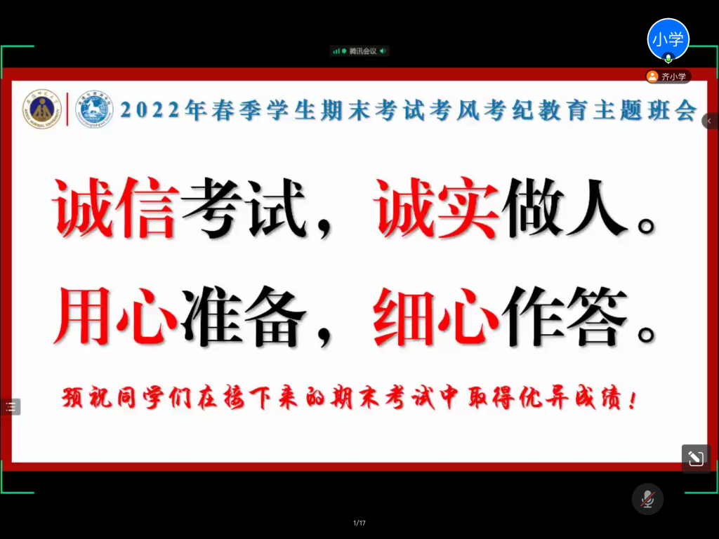 召开主题班会,夯实学生诚信考试思想。进一步强化学生诚信考试意识、规范学生考试行为,学院各年级辅导员先后召开了期末迎考和诚信考试教育“线上+线下”主题班会,解读学校考风考纪要求和违规违纪后果,扎实推进学院考风考纪教育行动方案,形成不敢违纪、不能违纪、不想违纪的清风正气。