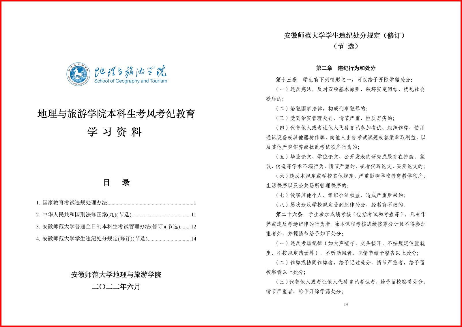 编订学习资料,提升学生诚信考试认识。进一步提高学生对考风考纪相关法律法规的认识和了解,学院编辑整理国家教育考试违规处理办法、安徽师范大学学生违纪处分规定(修订)等法律法规和校规校纪,编订了考风考纪教育学习资料,组织学生认真学习,提高认识。