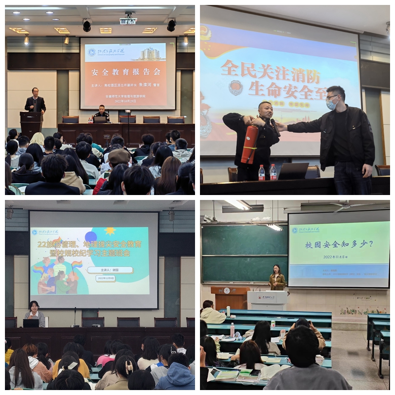学院精心组织系列安全教育,师生策划,院班联动,入脑入心。邀请芜湖市高校园区派出所副所长朱滦河为学院1828名本科生作安全教育专题报告,他从“网络安全”“政治安全”“消防安全”“交通安全”“治安安全”“防诈骗安全”等六个方面,为同学们详细讲解了身边常见的安全类型,现场演示了灭火器使用、防侵害自我保护等技能,并重点讲解了当前电信网络诈骗面临的新形势新特点,增强了同学们的安全意识。此外,辅导员利用主题班会、安全知识竞赛等方式为同学们科普安全知识,营造比学赶超学习安全知识的氛围。班级组织开展“校园安全知多少”、“逐梦向阳,从心出发”等主题班会,促进同学们身心健康发展。